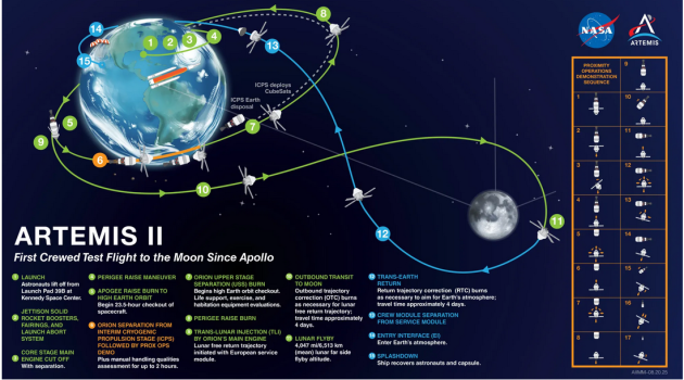 Durante o voo, os astronautas irão contornar a Lua – sem pousar – em uma trajetória de ida e volta, testando sistemas vitais da espaçonave Orion, como suporte à vida, navegação e comunicação.